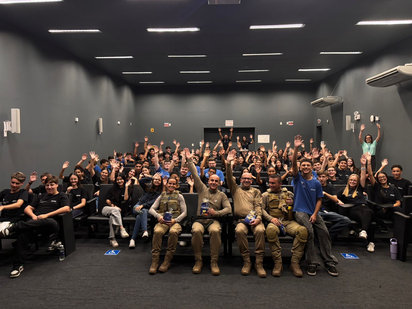 A palestra, intitulada “A Ilusão do Vapor: Quando a Droga Rouba Seu Futuro”, foi ministrada por policiais militares integrantes da Rede de Segurança Escolar e instrutores do PROERD, com foco na conscientização sobre os riscos do uso de drogas, especialmente os dispositivos eletrônicos de fumar (vapes), muitas vezes vistos de forma equivocada como inofensivos.