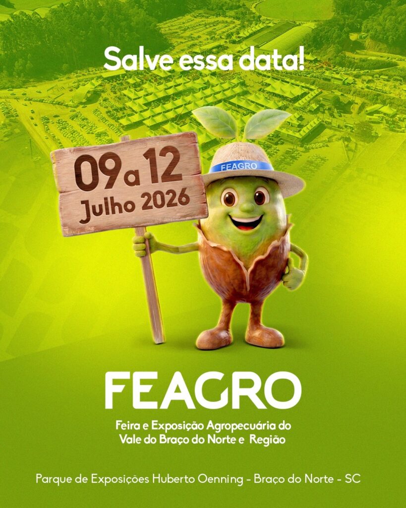 A Feira e Exposição Agropecuária do Vale de Braço do Norte e Região (Feagro) já tem data marcada para mais uma edição que promete entrar para a história. O evento acontece de 9 a 12 de julho de 2026, no Parque de Exposições Huberto Oenning, em Braço do Norte, reunindo o que há de mais moderno e representativo no agronegócio.