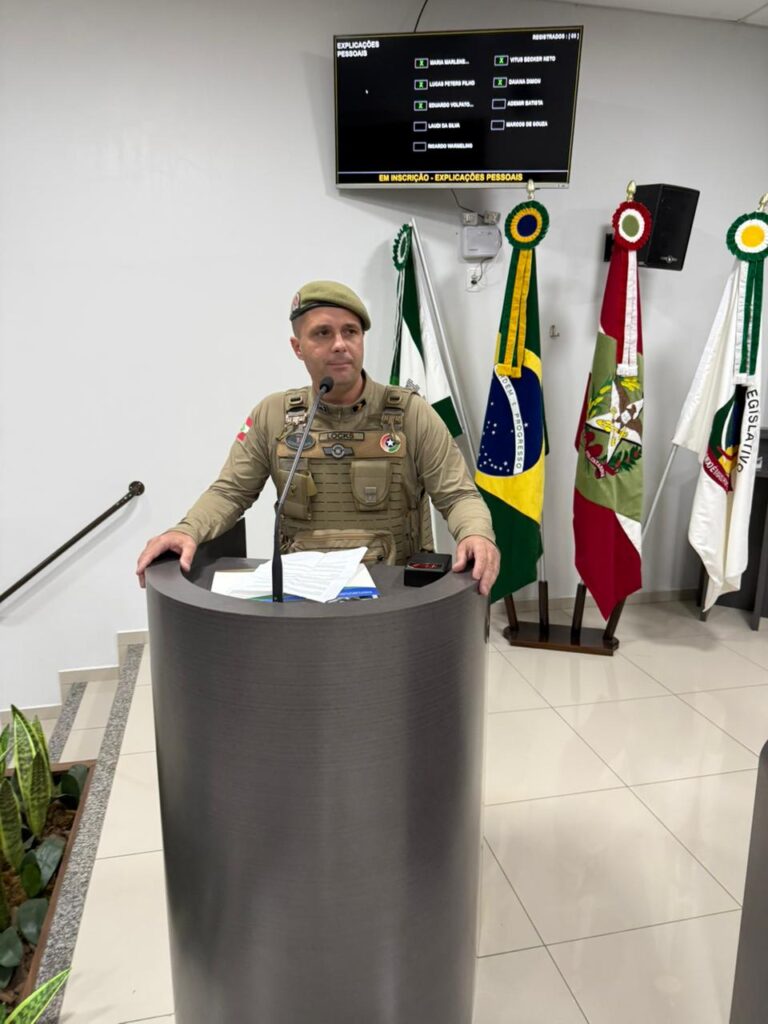 Durante a sessão, o 3º Sargento Fernando Martins Locks fez uso da tribuna, momento em que agradeceu o reconhecimento recebido e destacou o trabalho conjunto desenvolvido pela Polícia Militar no município.