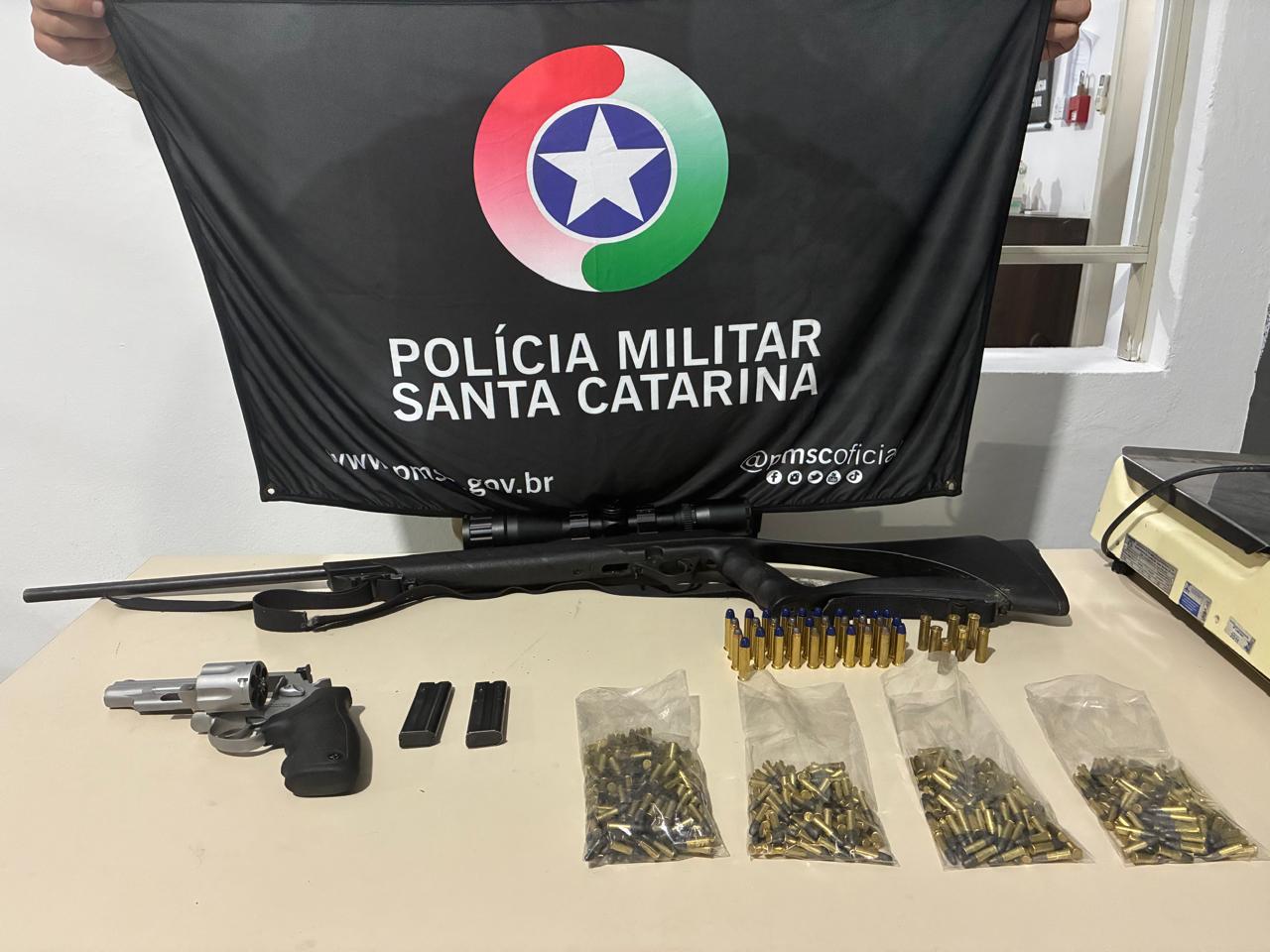 Diante do cenário, os policiais realizaram buscas na residência. No local, foram encontrados e apreendidos um rifle calibre .22 equipado com luneta, 485 munições intactas, dois carregadores, além de um revólver calibre .357 com 31 munições intactas e sete deflagradas.